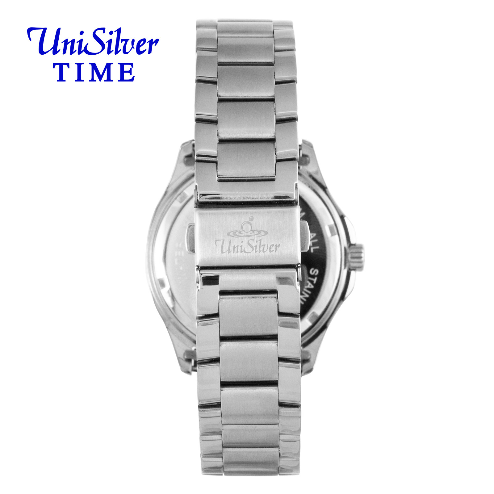 The UniSilver TIME Quantro Enviri men’s watch showcases timeless sophistication with a clean white analog dial housed in a distinctive square case. Crafted entirely from silver stainless steel, it offers both durability and a sleek, modern appeal. A scratch-resistant sapphire crystal protects the dial, ensuring long-lasting clarity and resilience through everyday wear. Designed to transition effortlessly from formal settings to casual occasions, the Quantro is a statement of understated elegance and dependable craftsmanship.