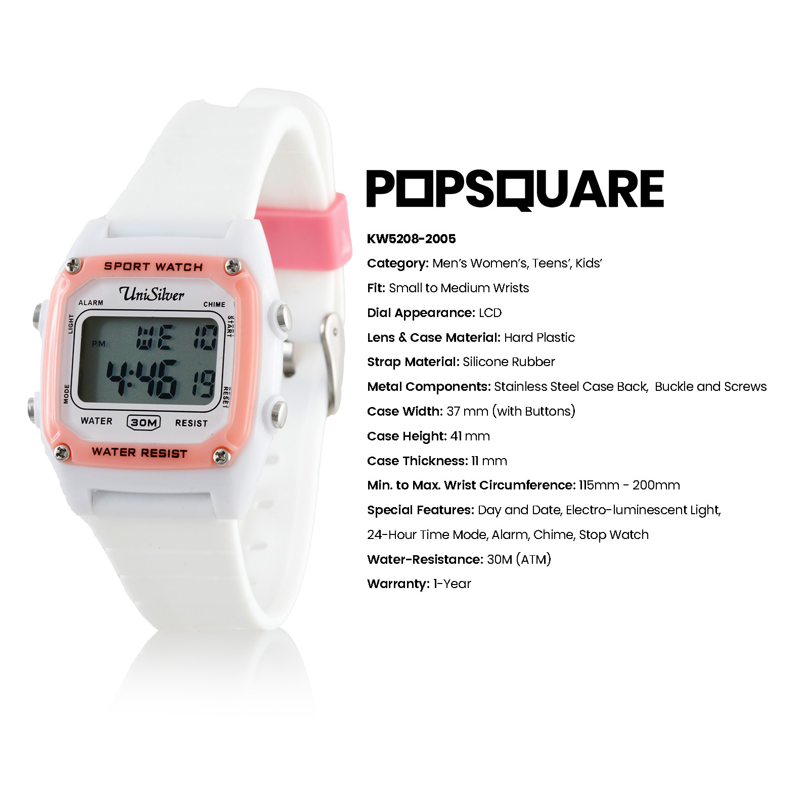 The PopSquare digital watch by UniSilver TIME is a modern, playful watch with a bold square design, made for everyday casual wear. Its sleek and vibrant look makes it easy to style with any outfit, whether you’re heading out for fun with friends, enjoying weekend adventures, or just adding a pop of personality to your day. Durable and comfortable, it’s designed to be a reliable companion for all your daily moments.