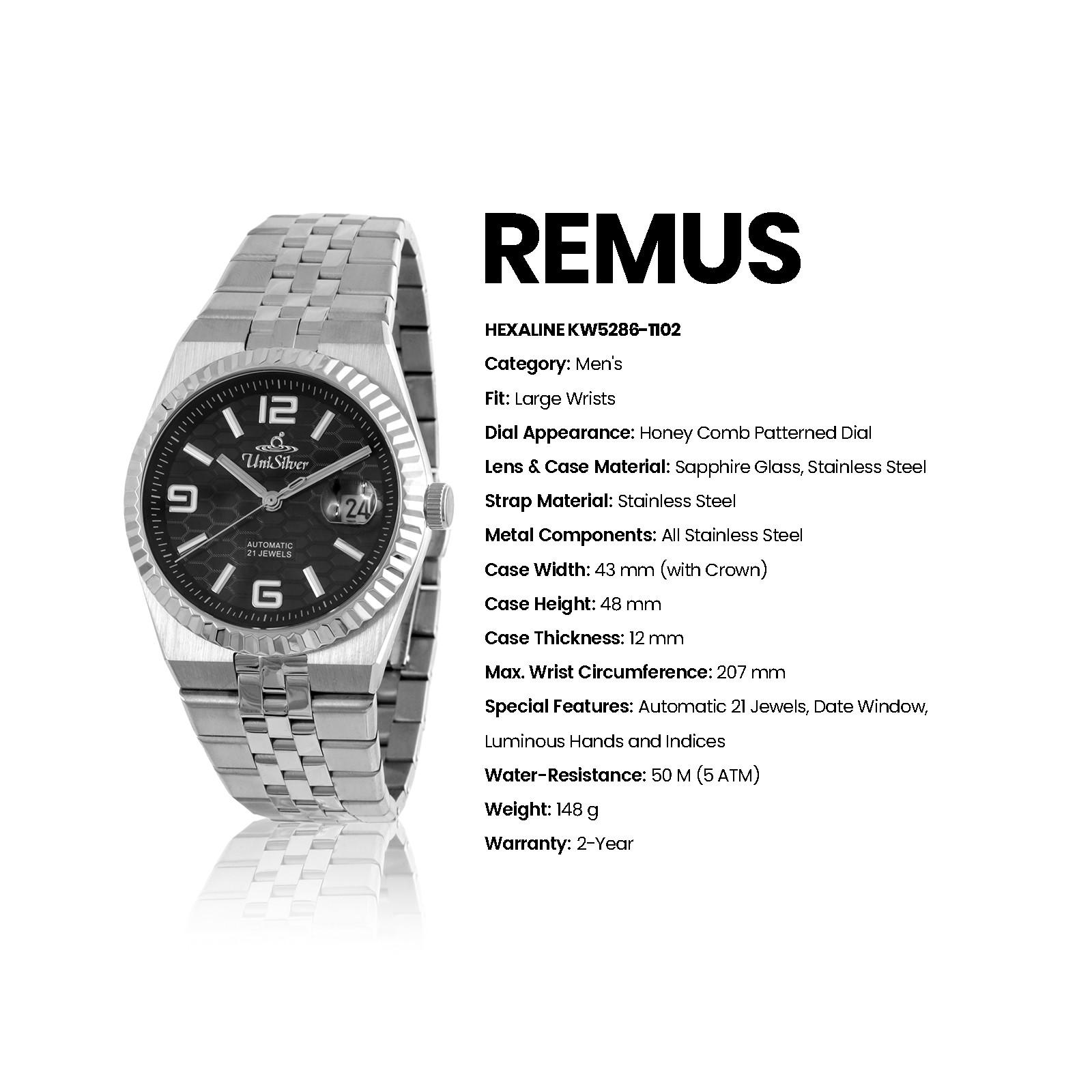 Equipped with luminous hands and markers, a practical date window, and 50M water resistance, the Remus Hexaline is designed to adapt effortlessly from routine days to more polished settings.