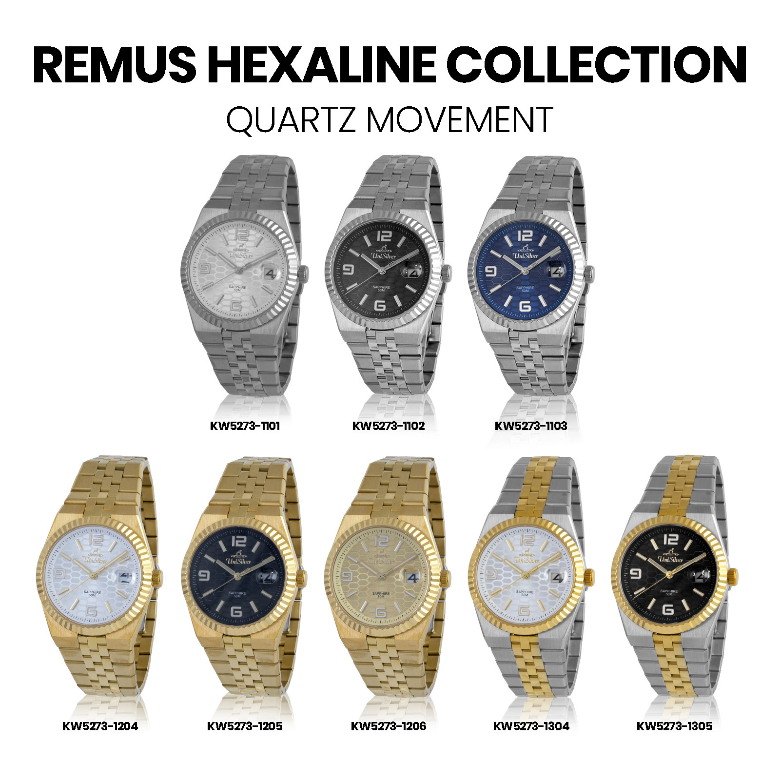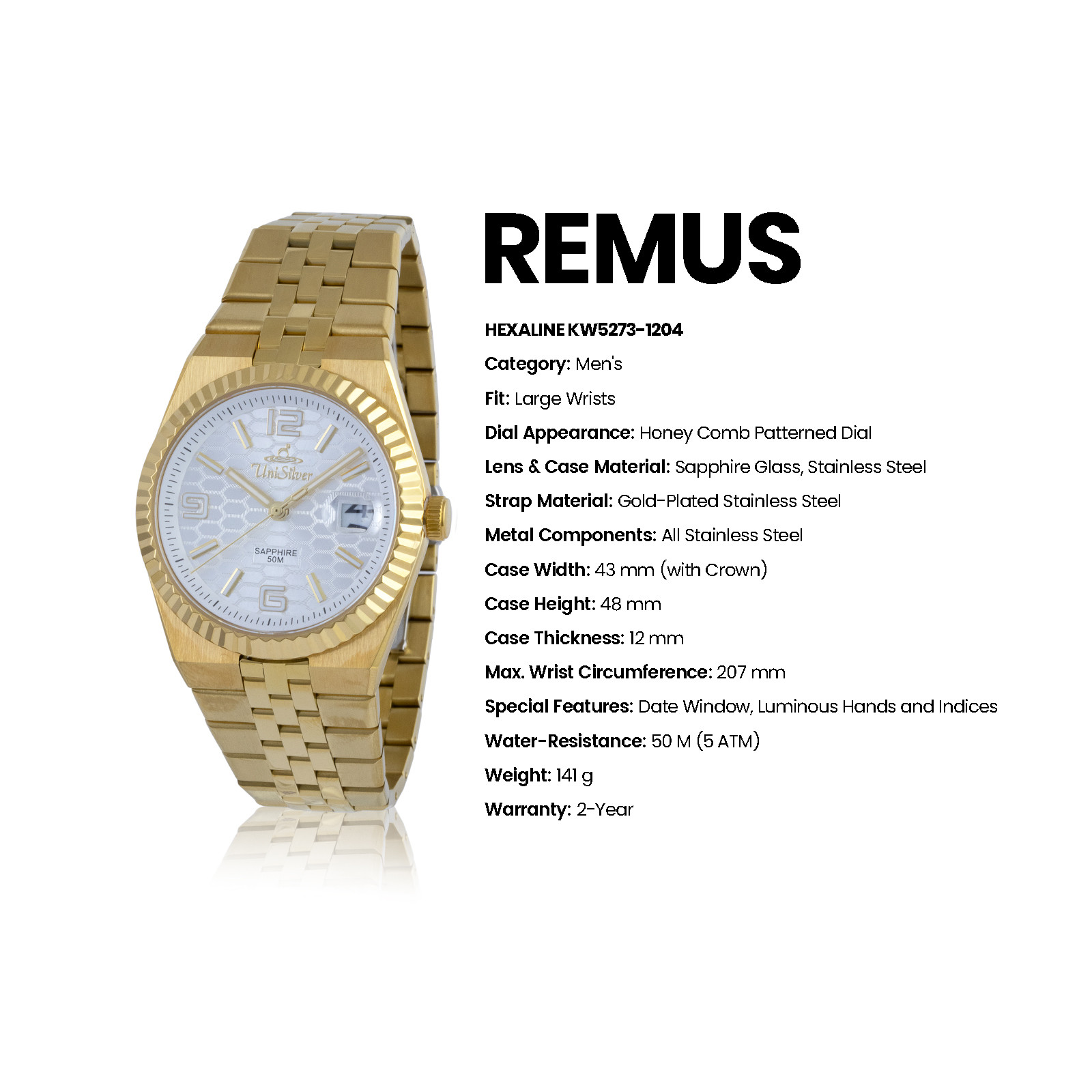 With luminous hands, a practical date window, and 50M water resistance, the Remus Hexaline easily moves from day-to-day wear to more refined occasions.
