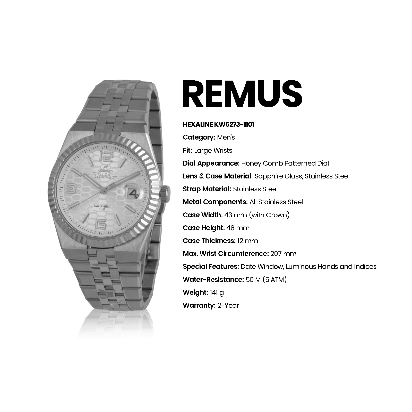 With luminous hands, a practical date window, and 50M water resistance, the Remus Hexaline easily moves from day-to-day wear to more refined occasions.