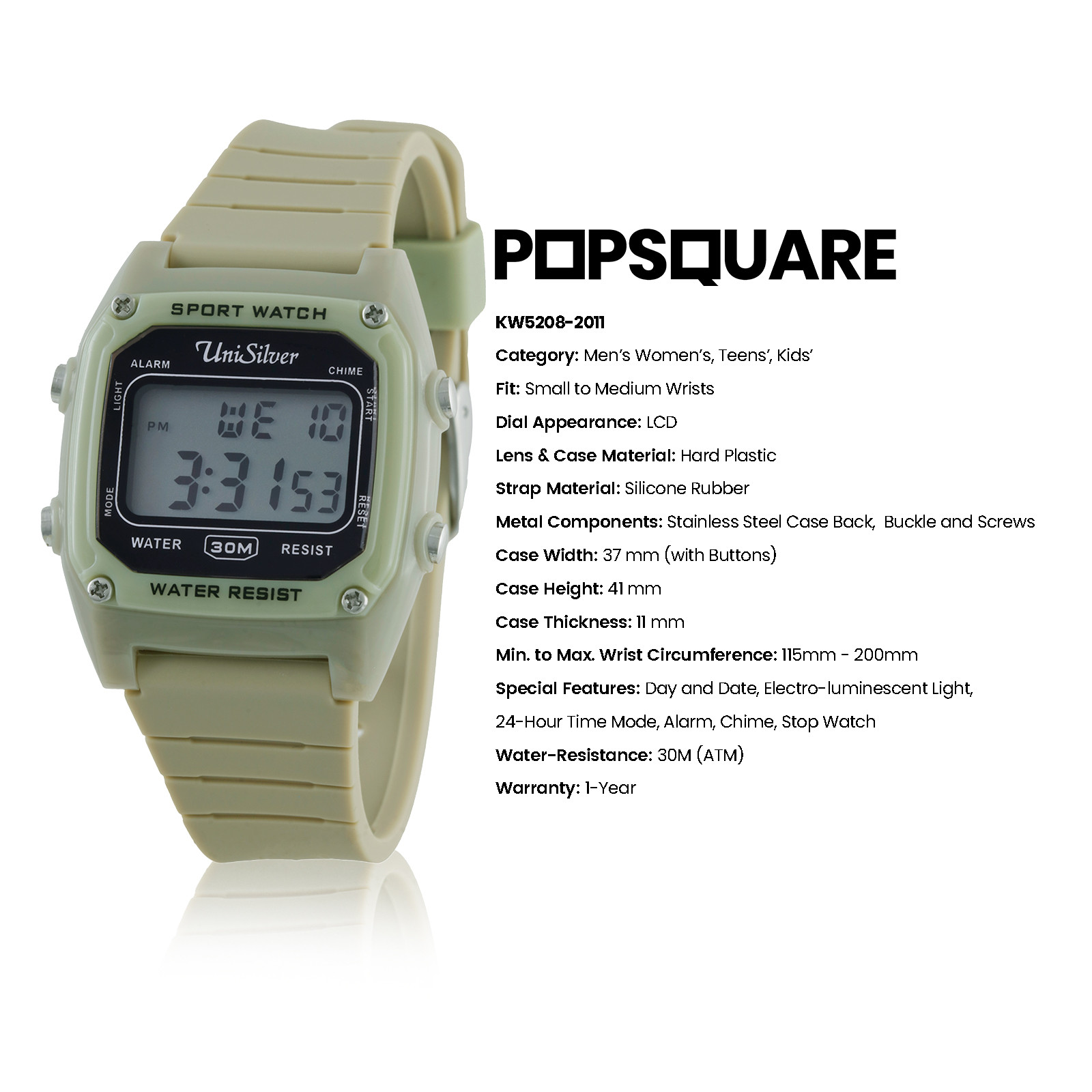 The PopSquare digital watch by UniSilver TIME is a modern, playful watch with a bold square design, made for everyday casual wear. Its sleek and vibrant look makes it easy to style with any outfit, whether you’re heading out for fun with friends, enjoying weekend adventures, or just adding a pop of personality to your day. Durable and comfortable, it’s designed to be a reliable companion for all your daily moments.