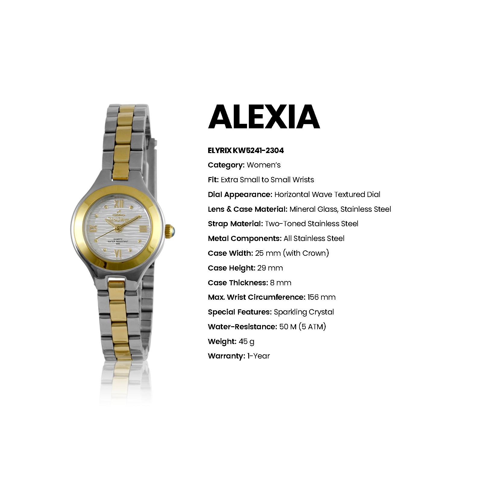 The ALEXIA Elyrix by UniSilver TIME reflects modern elegance and refined versatility, designed with clean design and polished stainless steel craftsmanship. Available in a variety of bracelet finishes and dial colors, it blends timeless style with everyday functionality. Featuring a clean dial with refined detailing, Elyrix highlights classic sophistication and subtle brilliance. Versatile and elegant, it transitions effortlessly from casual wear to formal occasions.