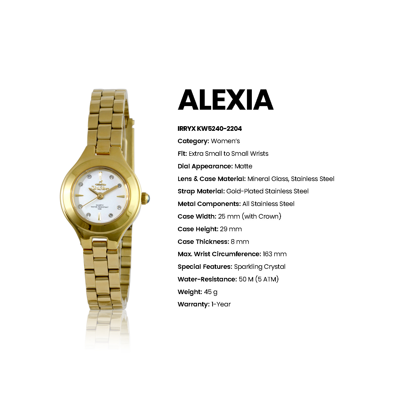 The ALEXIA Irryx by UniSilver TIME reflects modern elegance and refined versatility, designed with clean design and polished stainless steel craftsmanship. Available in a variety of bracelet finishes and dial colors, it blends timeless style with everyday functionality. Featuring a clean dial with refined detailing, Irryx highlights classic sophistication and subtle brilliance. Versatile and elegant, it transitions effortlessly from casual wear to formal occasions.