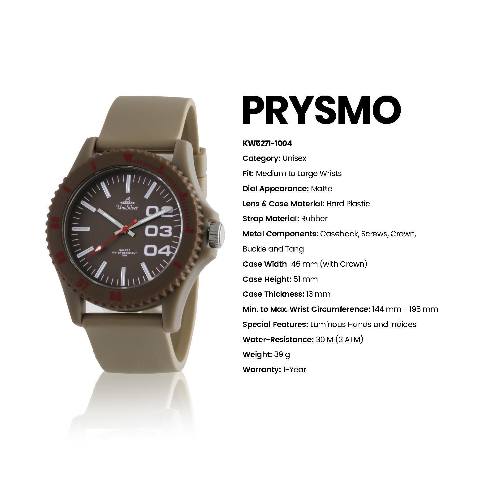 Step into everyday reliability with the Prysmo timepiece, crafted for those who value both function and style. Designed for medium to large wrists, this unisex watch features a bold case and a durable rubber strap for all-day comfort. Its precise Japan movement ensures accurate timekeeping, while luminous hands and indices provide easy readability even in low light. Built with sturdy materials and water resistance up to 30 meters, this watch is a dependable companion for everyday wear and casual occasions. Watch Care (Stainless Steel Case & Bracelet · Sapphire Crystal) a.) Made for everyday moments. Wipe with a soft, dry cloth to keep it looking its best. b.) Avoid contact with chemicals, perfumes, and extreme heat. c.) Sapphire crystal resists scratches, but avoids hard impacts. d.) Follow the indicated water-resistance rating and keep the crown secured. e.) Store in a dry place when not in use. Periodic servicing helps maintain optimal performance. Over time, fine marks on stainless steel reflect a watch well worn — and well lived.