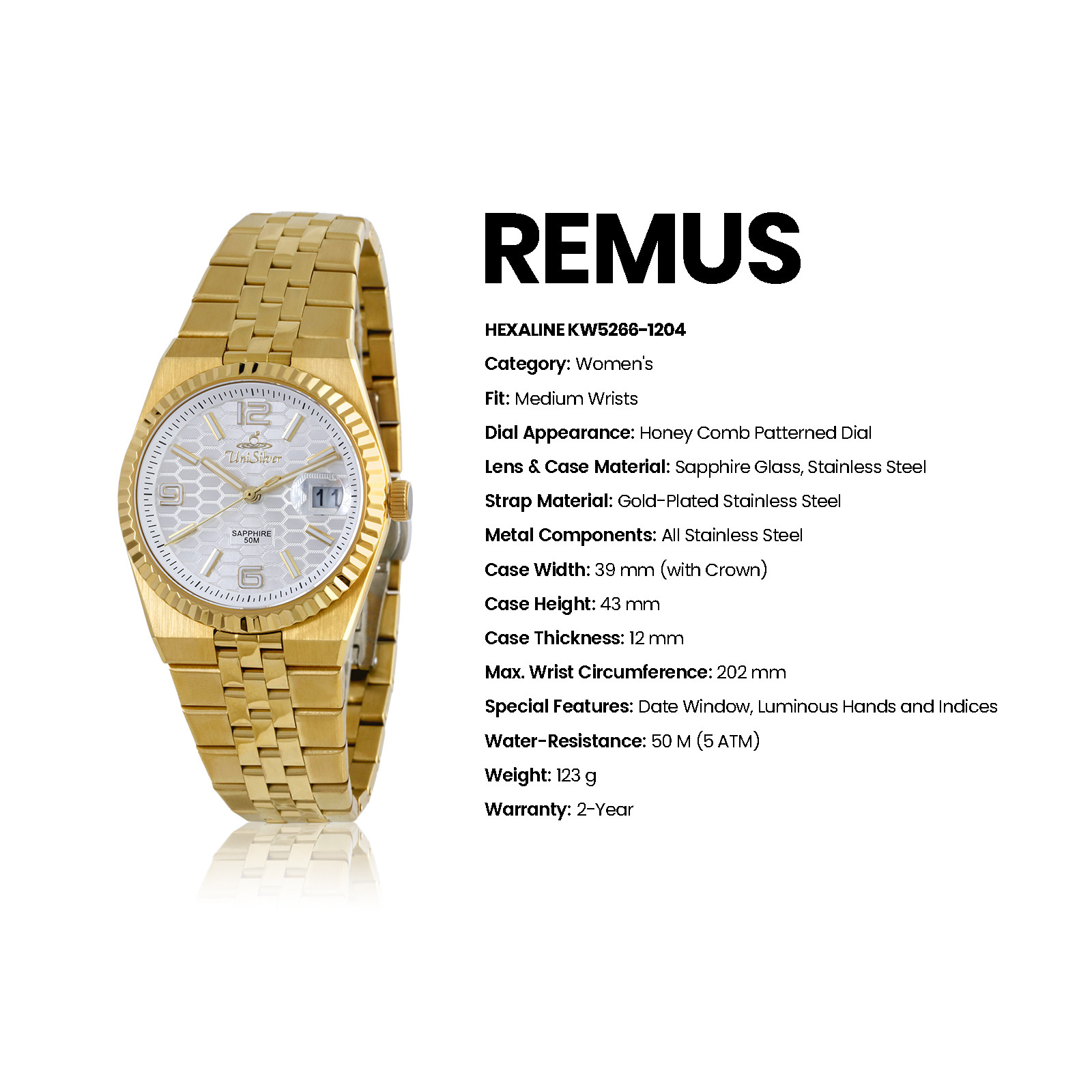 Featuring luminous hands and markers, a handy date function, and 50M water resistance, the Remus Hexaline is designed to keep up with both your daily routine and special occasions.