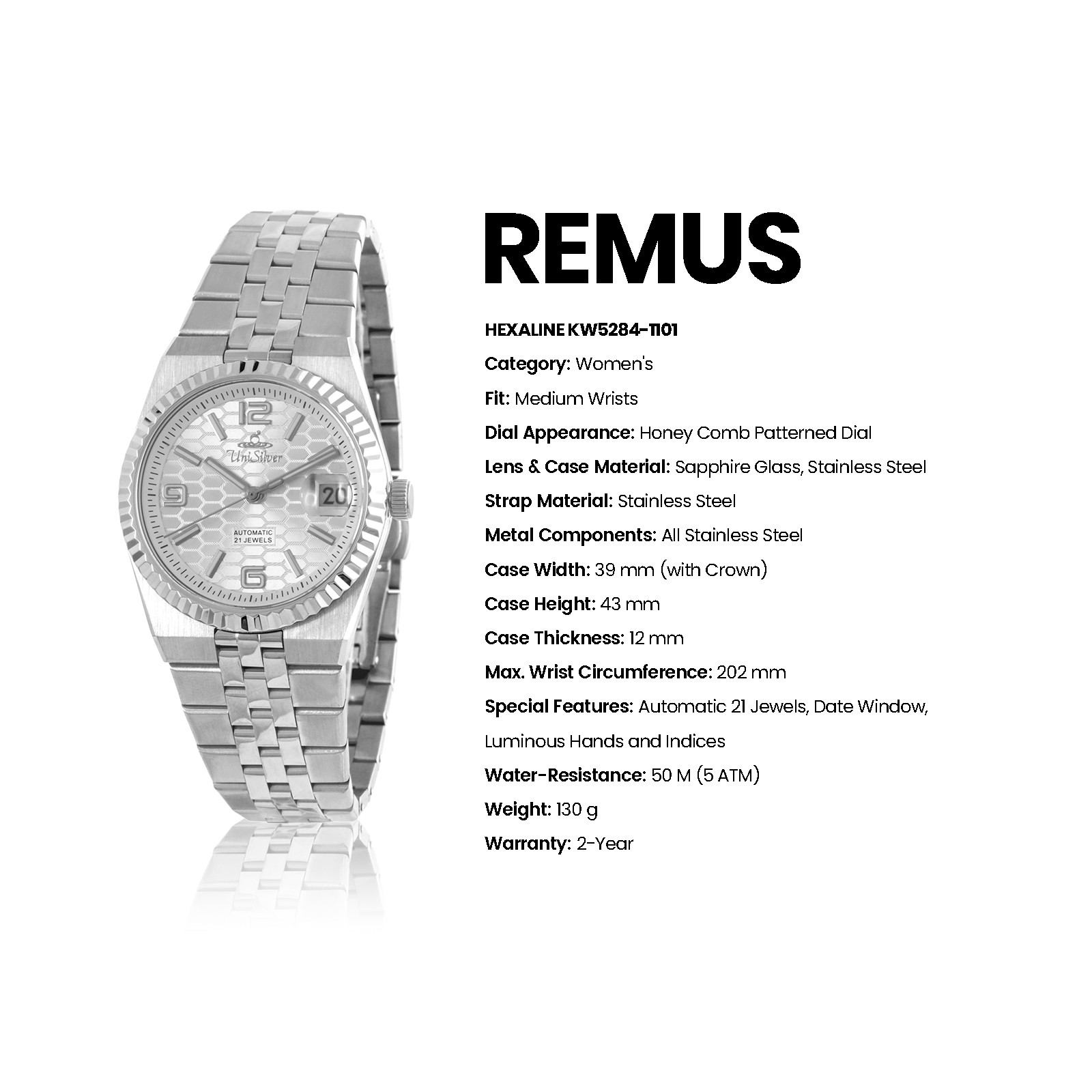 Complete with luminous markers, a date display, and 50M water resistance, the Remus Hexaline effortlessly transitions from daily moments to special occasions.