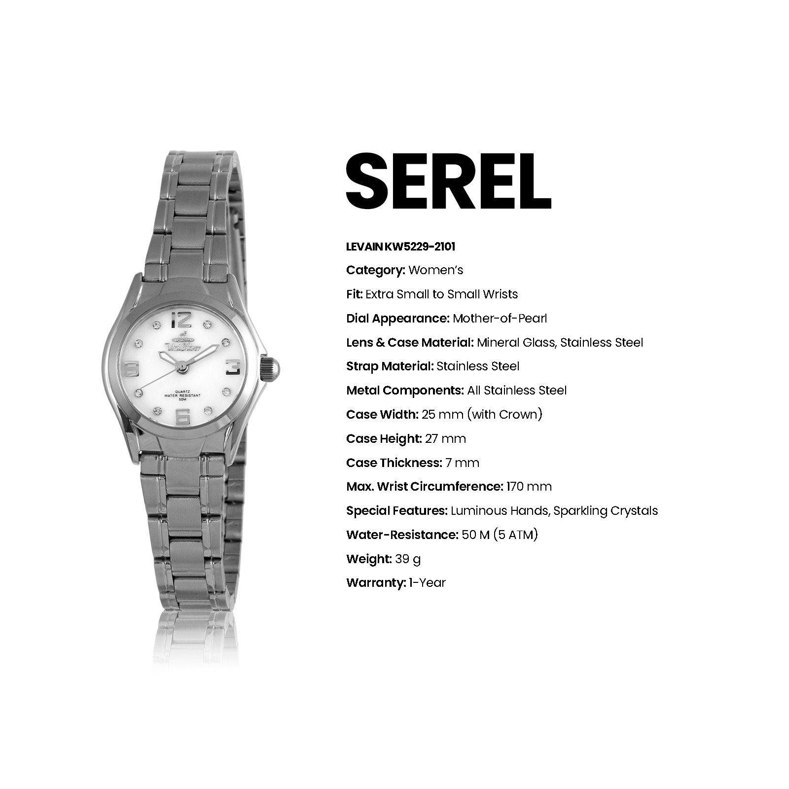 With its luminous hands, mother-of-pearl dial and refined detailing, Levain brings quiet sophistication to every moment. Powered by reliable Japan movement and crafted in stainless steel with 50M water resistance, it’s designed to shine effortlessly from day to night.