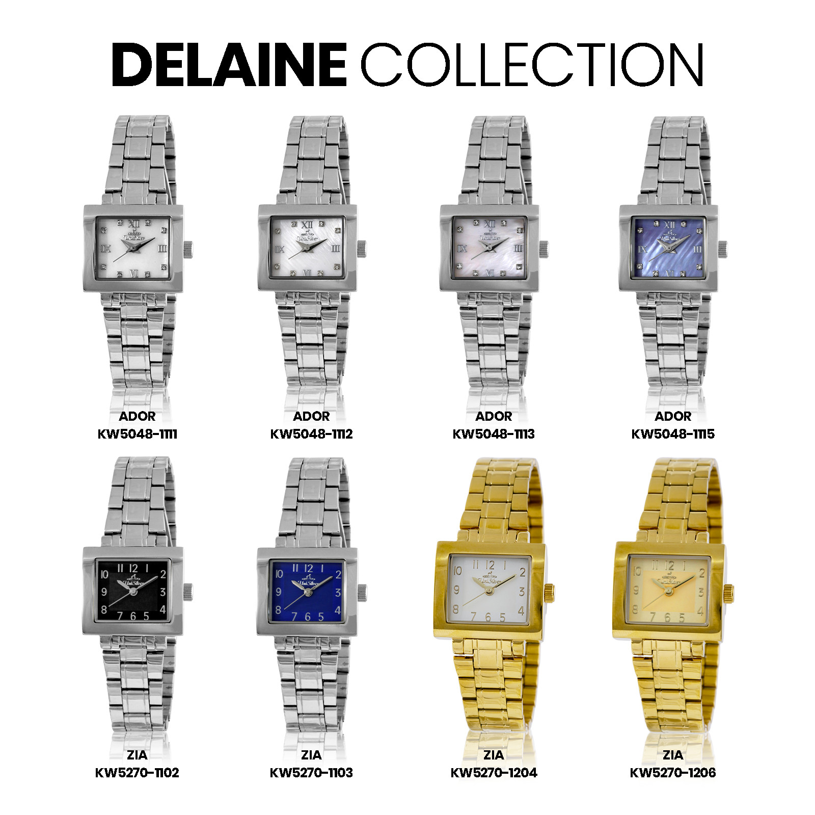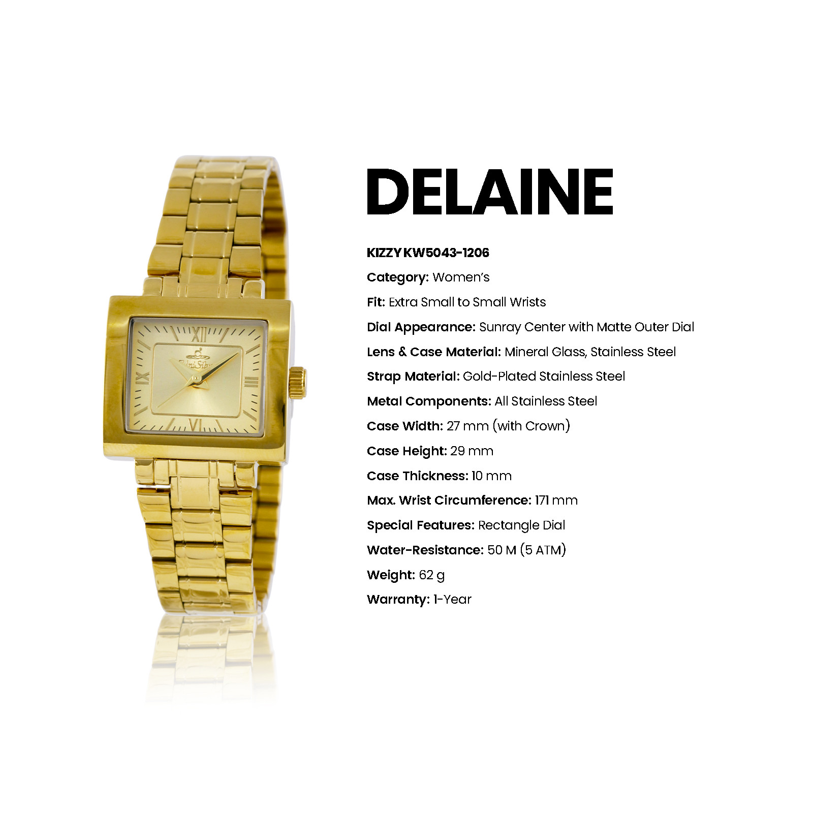 Radiate sophistication with the Delaine Kizzy timepiece from UniSilver TIME. This accessory gleams with its sleek bracelet. The rectangular-shaped dial is the perfect statement for this elegant watch. Watch Care (Stainless Steel Case & Bracelet · Sapphire Crystal) a.) Made for everyday moments. Wipe with a soft, dry cloth to keep it looking its best. b.) Avoid contact with chemicals, perfumes, and extreme heat. c.) Sapphire crystal resists scratches, but avoids hard impacts. d.) Follow the indicated water-resistance rating and keep the crown secured. e.) Store in a dry place when not in use. Periodic servicing helps maintain optimal performance. Over time, fine marks on stainless steel reflect a watch well worn — and well lived.