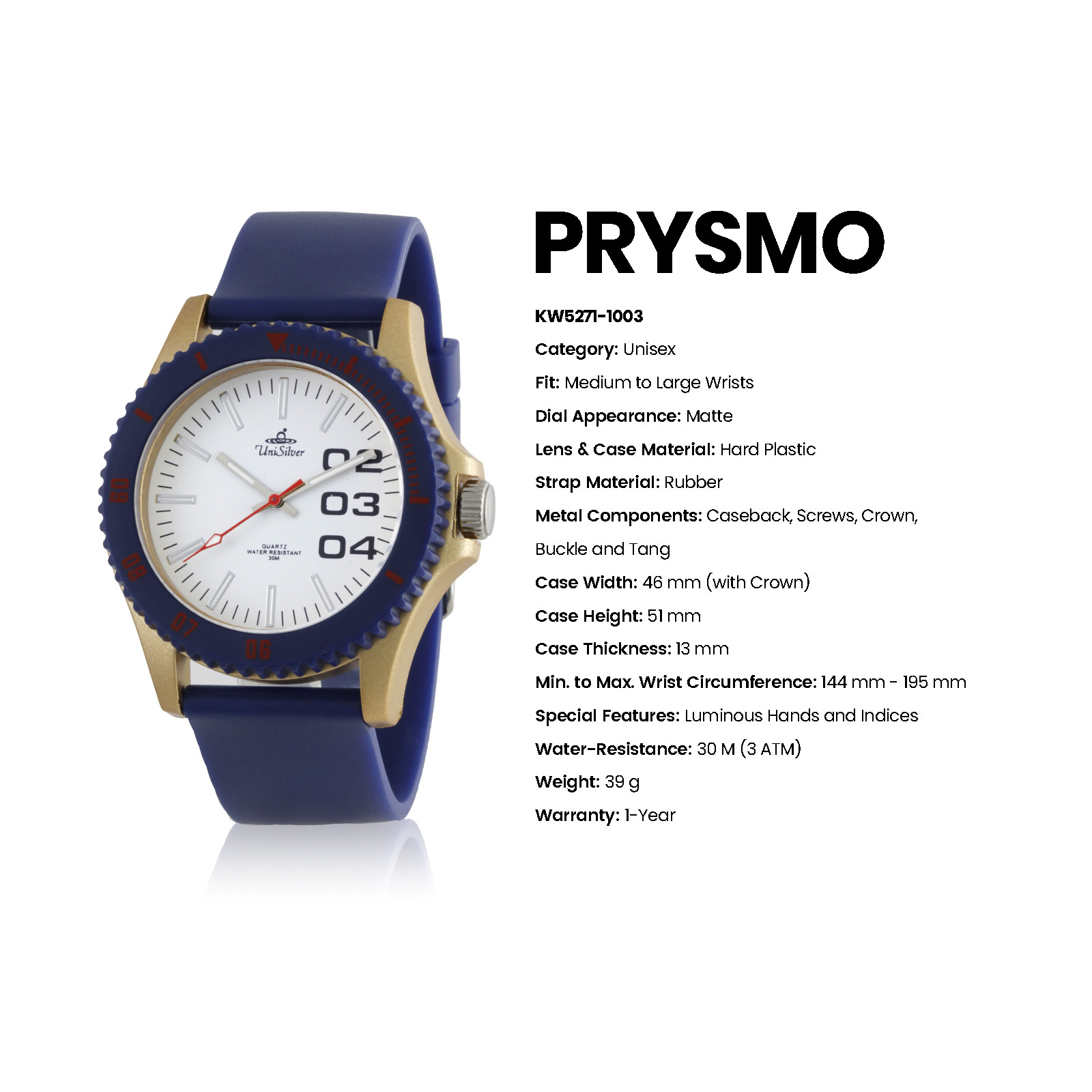 Step into everyday reliability with the Prysmo timepiece, crafted for those who value both function and style. Designed for medium to large wrists, this unisex watch features a bold case and a durable rubber strap for all-day comfort. Its precise Japan movement ensures accurate timekeeping, while luminous hands and indices provide easy readability even in low light. Built with sturdy materials and water resistance up to 30 meters, this watch is a dependable companion for everyday wear and casual occasions. Watch Care (Stainless Steel Case & Bracelet · Sapphire Crystal) a.) Made for everyday moments. Wipe with a soft, dry cloth to keep it looking its best. b.) Avoid contact with chemicals, perfumes, and extreme heat. c.) Sapphire crystal resists scratches, but avoids hard impacts. d.) Follow the indicated water-resistance rating and keep the crown secured. e.) Store in a dry place when not in use. Periodic servicing helps maintain optimal performance. Over time, fine marks on stainless steel reflect a watch well worn — and well lived.