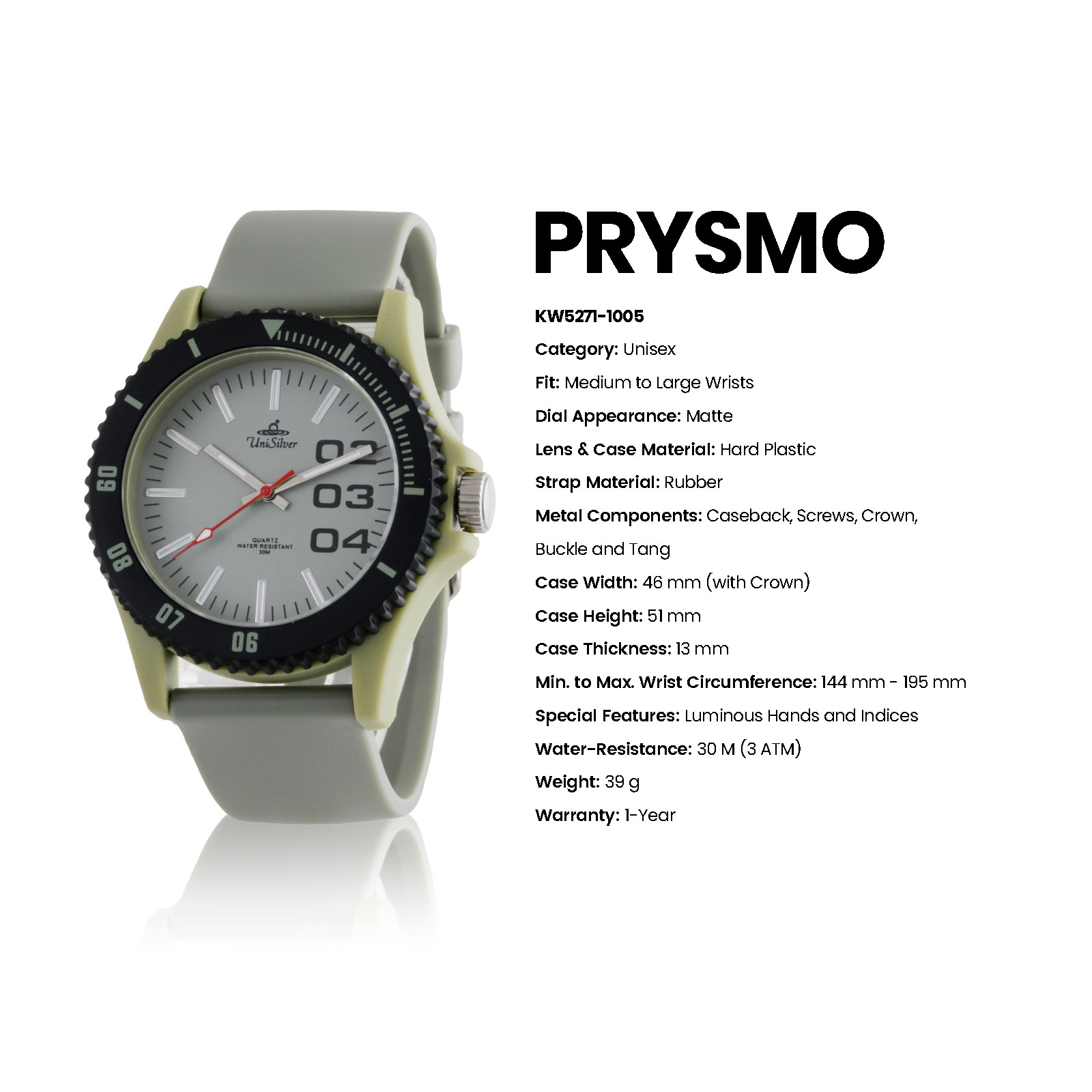 Step into everyday reliability with the Prysmo timepiece, crafted for those who value both function and style. Designed for medium to large wrists, this unisex watch features a bold case and a durable rubber strap for all-day comfort. Its precise Japan movement ensures accurate timekeeping, while luminous hands and indices provide easy readability even in low light. Built with sturdy materials and water resistance up to 30 meters, this watch is a dependable companion for everyday wear and casual occasions. Watch Care (Stainless Steel Case & Bracelet · Sapphire Crystal) a.) Made for everyday moments. Wipe with a soft, dry cloth to keep it looking its best. b.) Avoid contact with chemicals, perfumes, and extreme heat. c.) Sapphire crystal resists scratches, but avoids hard impacts. d.) Follow the indicated water-resistance rating and keep the crown secured. e.) Store in a dry place when not in use. Periodic servicing helps maintain optimal performance. Over time, fine marks on stainless steel reflect a watch well worn — and well lived.