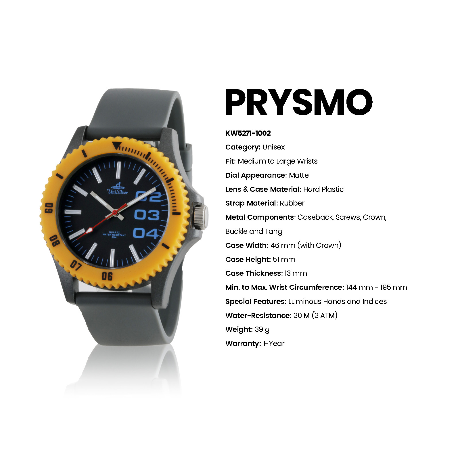 Step into everyday reliability with the Prysmo timepiece, crafted for those who value both function and style. Designed for medium to large wrists, this unisex watch features a bold case and a durable rubber strap for all-day comfort. Its precise Japan movement ensures accurate timekeeping, while luminous hands and indices provide easy readability even in low light. Built with sturdy materials and water resistance up to 30 meters, this watch is a dependable companion for everyday wear and casual occasions. Watch Care (Stainless Steel Case & Bracelet · Sapphire Crystal) a.) Made for everyday moments. Wipe with a soft, dry cloth to keep it looking its best. b.) Avoid contact with chemicals, perfumes, and extreme heat. c.) Sapphire crystal resists scratches, but avoids hard impacts. d.) Follow the indicated water-resistance rating and keep the crown secured. e.) Store in a dry place when not in use. Periodic servicing helps maintain optimal performance. Over time, fine marks on stainless steel reflect a watch well worn — and well lived.