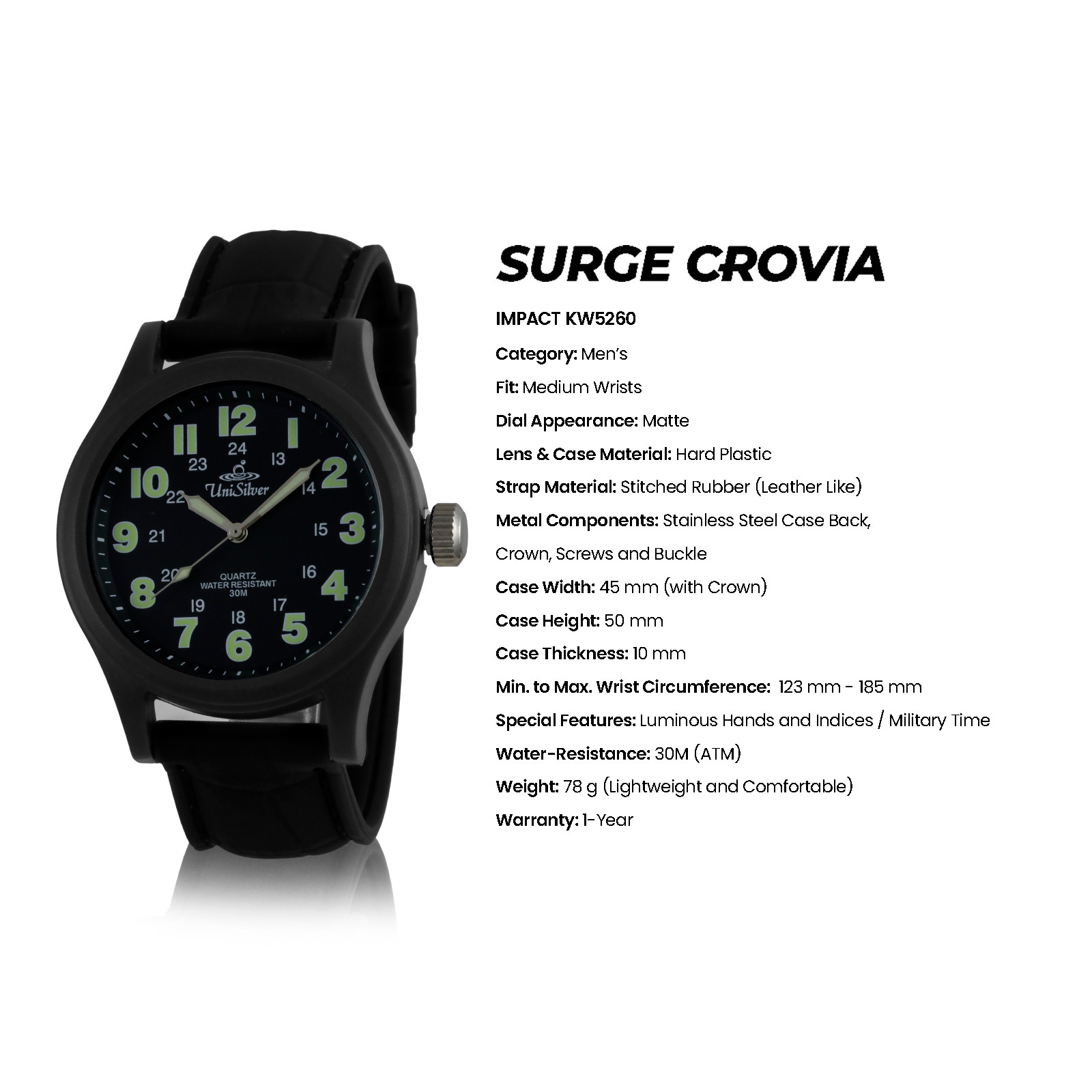 SURGE CROVIA MEN'S/ Medium/ Surge Crovia Impact/ Analog/ Luminous Hands and Indices/ Military Time/ Light Green/ Black Stitched Ruuber (Leather Like)/ KW5260-1001 Watch