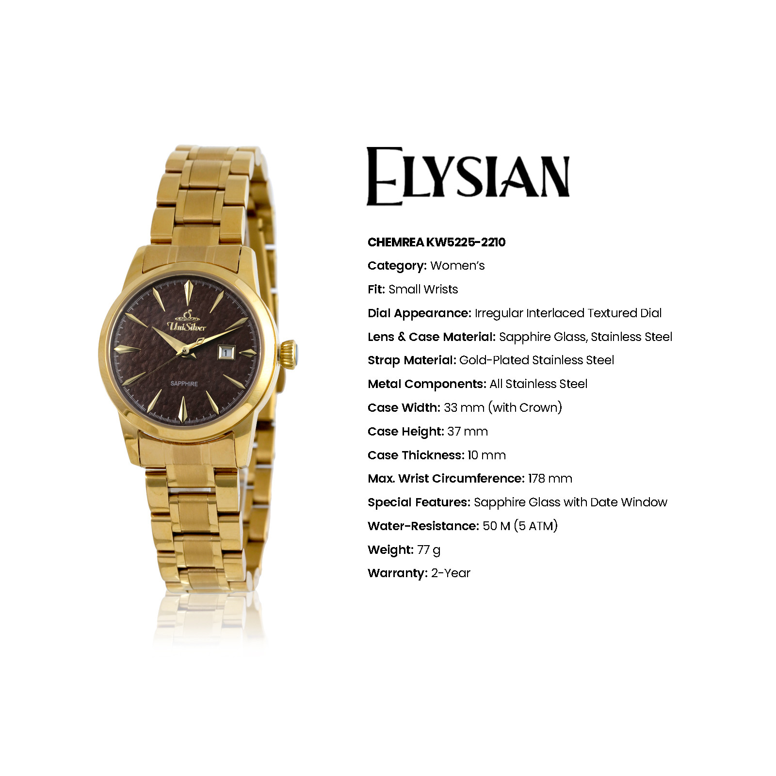 Exquisiteness that hypnotizes marks the Elysian Chemrea watch from UniSilver TIME. Mesmerize them with your refined taste for impeccable fashion with this magnificent timepiece. It's made of high-quality and durable materials to last for years to come.