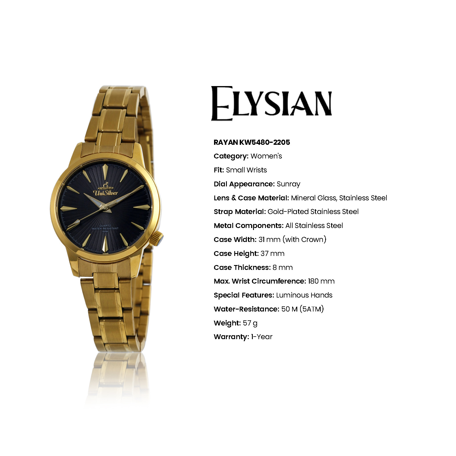 The Elysian Rayan Women’s Watch is a celebration of timeless elegance and graceful design. Crafted with meticulous attention to detail, it embodies sophistication in every element – from its delicate design to its refined finish. This exquisite timepiece transcends fleeting trends, offering a classic charm that enhances any ensemble. More than just a watch, it is a statement of poise and confidence for the woman who appreciates true luxury.