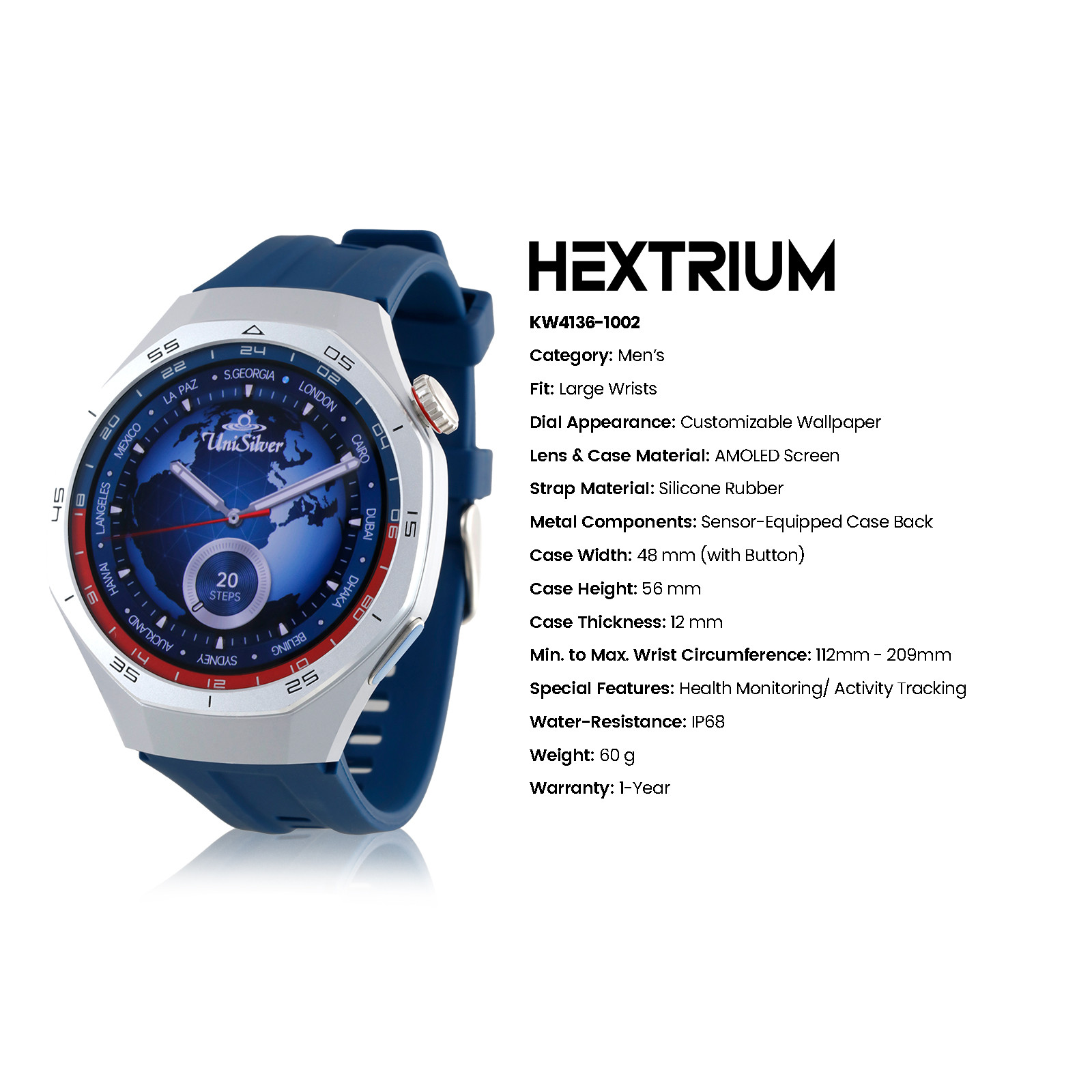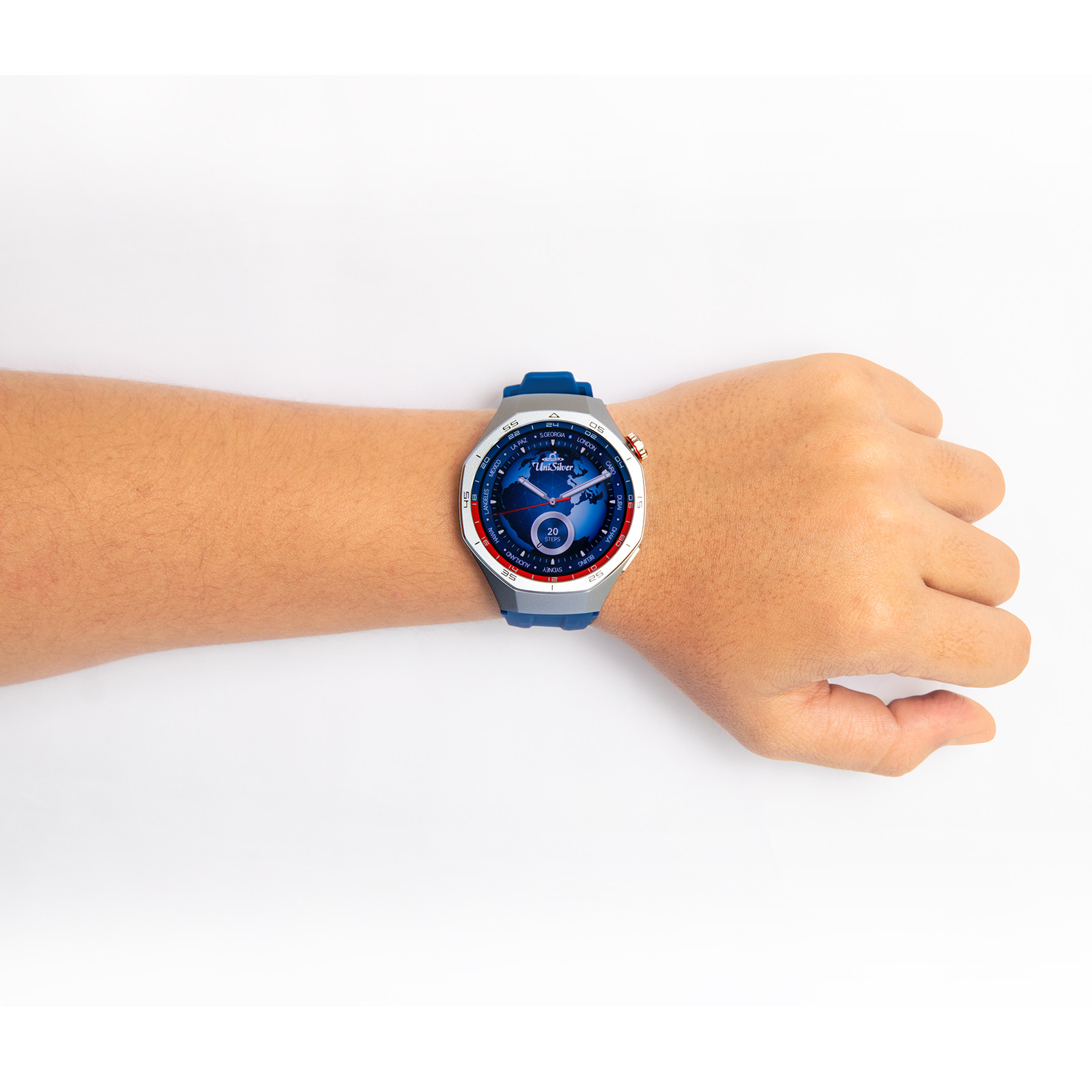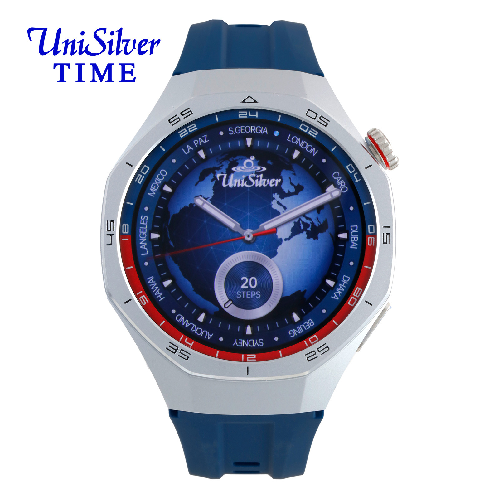Elevate your lifestyle with the UniSilver TIME Hextrium Smartwatch, packed with advanced features to keep you connected, healthy, and active. Monitor your blood pressure, oxygen levels, heart rate, and stress with ease. Stay on top of your fitness goals with activity tracking, a pedometer, and over 100 sport modes. This smartwatch also offers smart notifications, Bluetooth calling, music control, and even a built-in AI voice assistant to simplify your day.