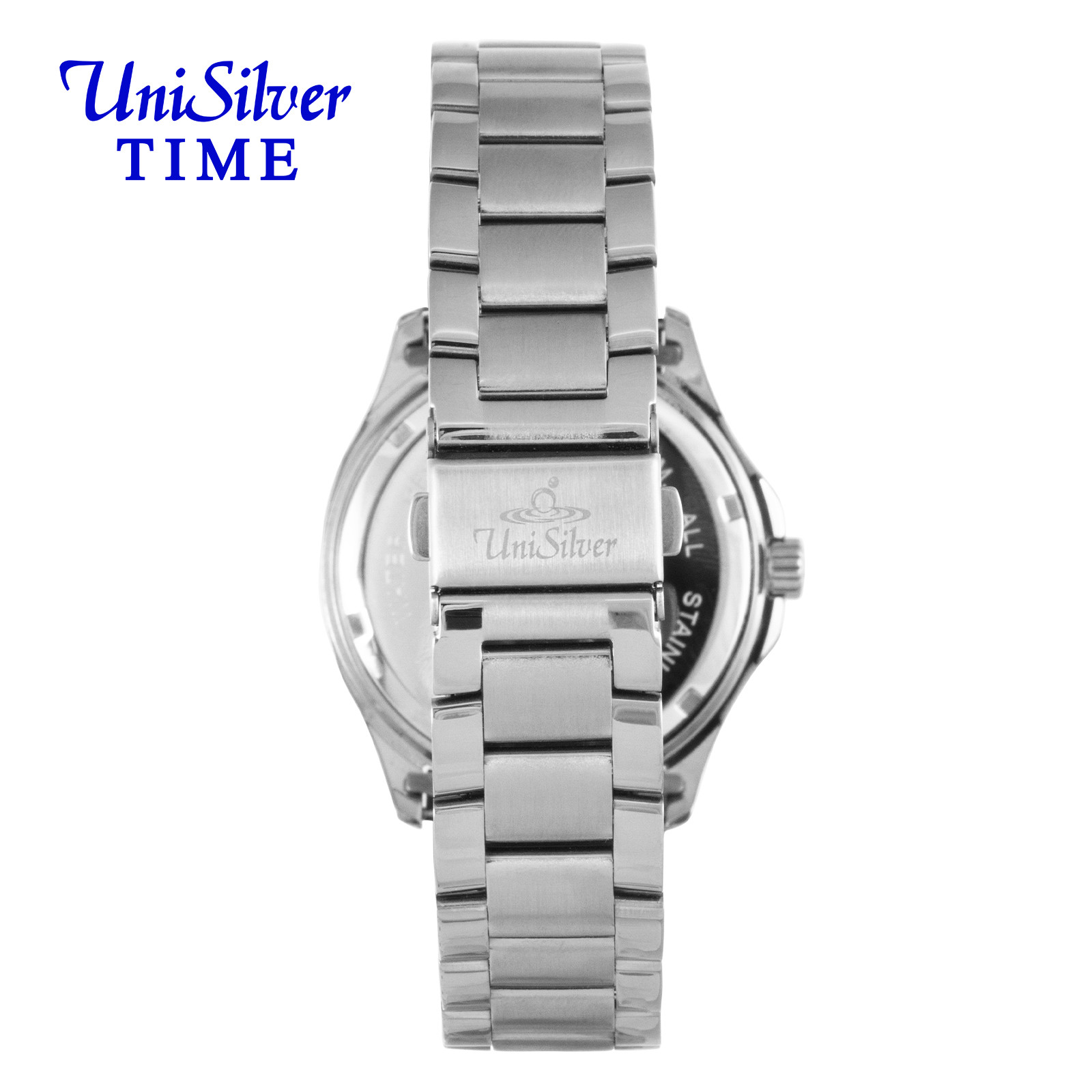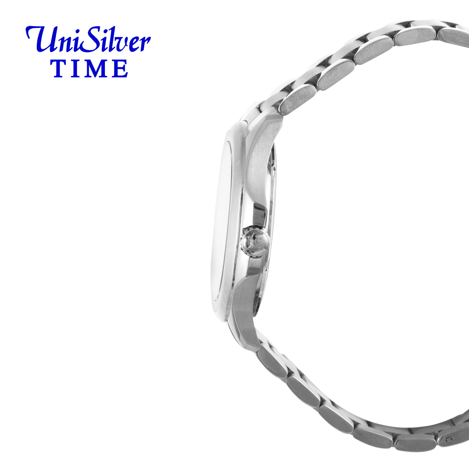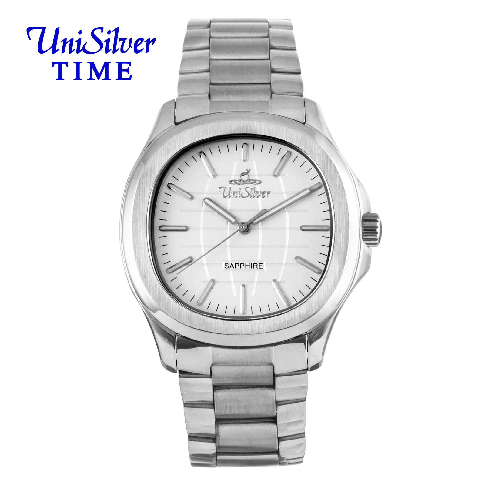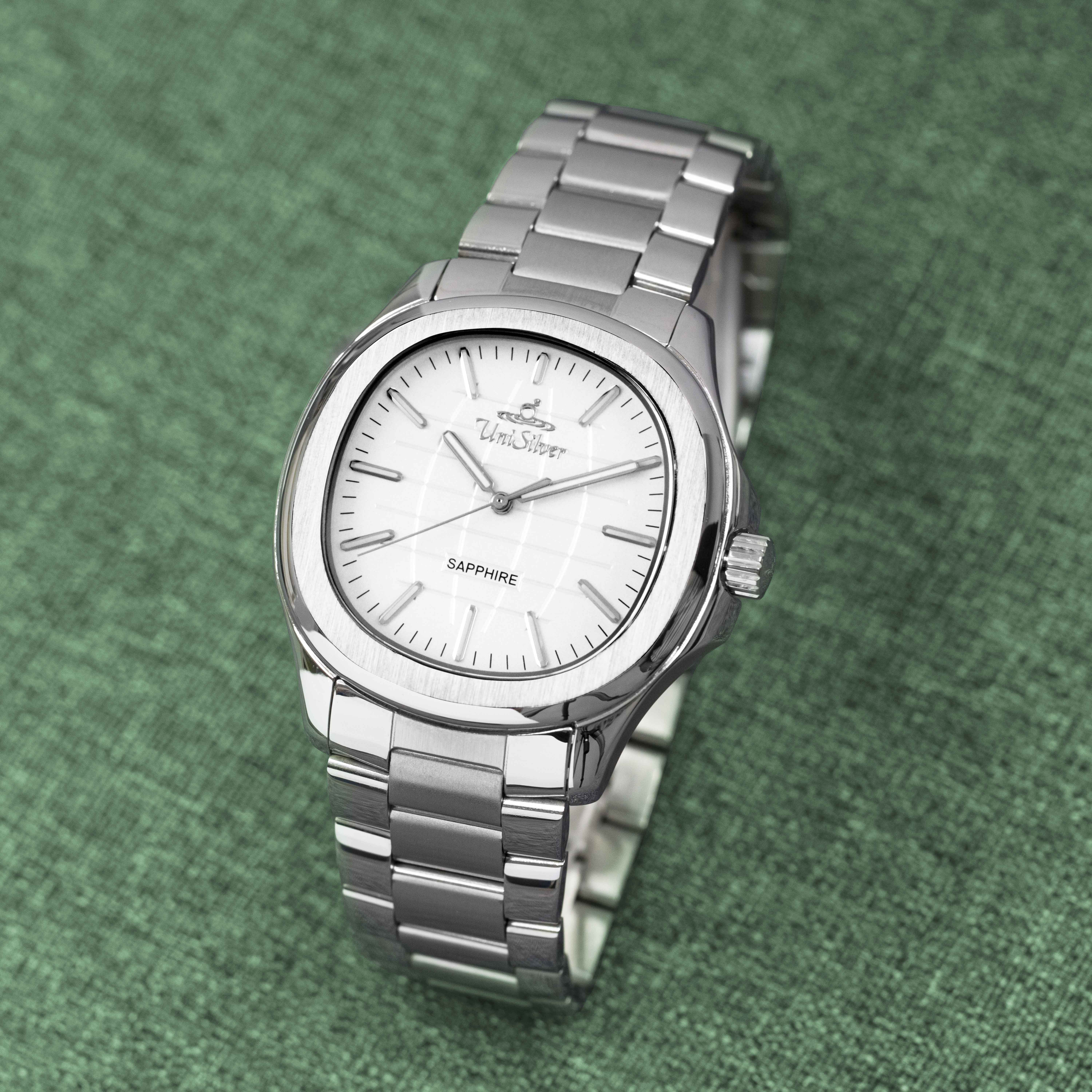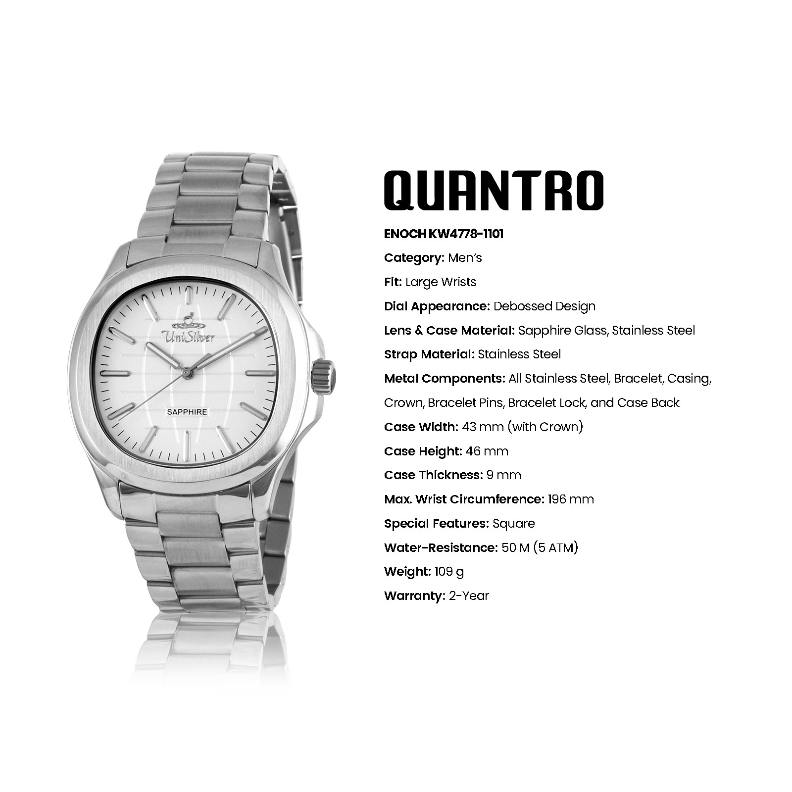 The UniSilver TIME Quantro Enoch men’s watch showcases timeless sophistication with a clean black analog dial housed in a distinctive square case. Crafted entirely from silver stainless steel, it offers both durability and a sleek, modern appeal. A scratch-resistant sapphire crystal protects the dial, ensuring long-lasting clarity and resilience through everyday wear. Designed to transition effortlessly from formal settings to casual occasions, the Quantro is a statement of understated elegance and dependable craftsmanship.