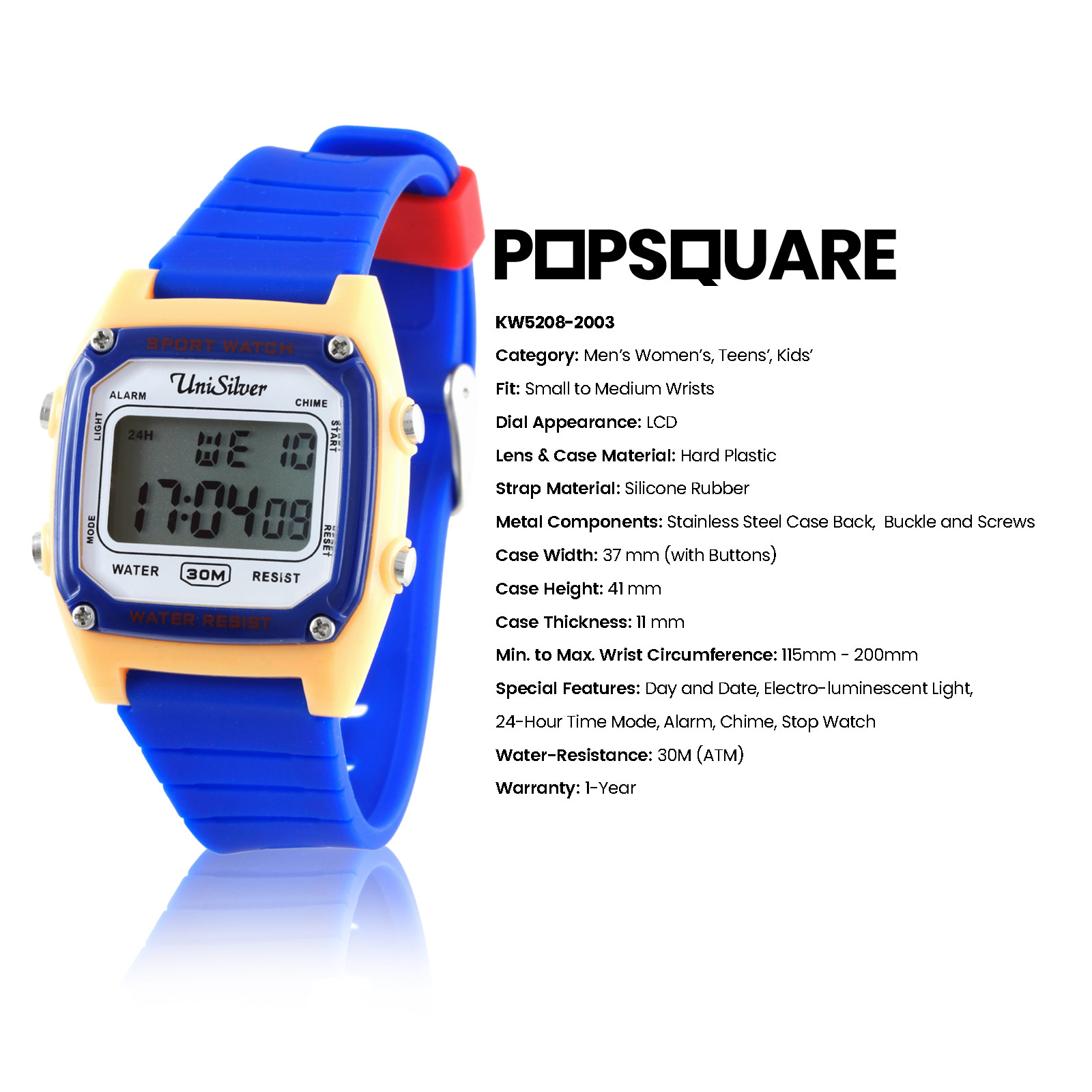 The PopSquare digital watch by UniSilver TIME is a modern, playful watch with a bold square design, made for everyday casual wear. Its sleek and vibrant look makes it easy to style with any outfit, whether you’re heading out for fun with friends, enjoying weekend adventures, or just adding a pop of personality to your day. Durable and comfortable, it’s designed to be a reliable companion for all your daily moments.