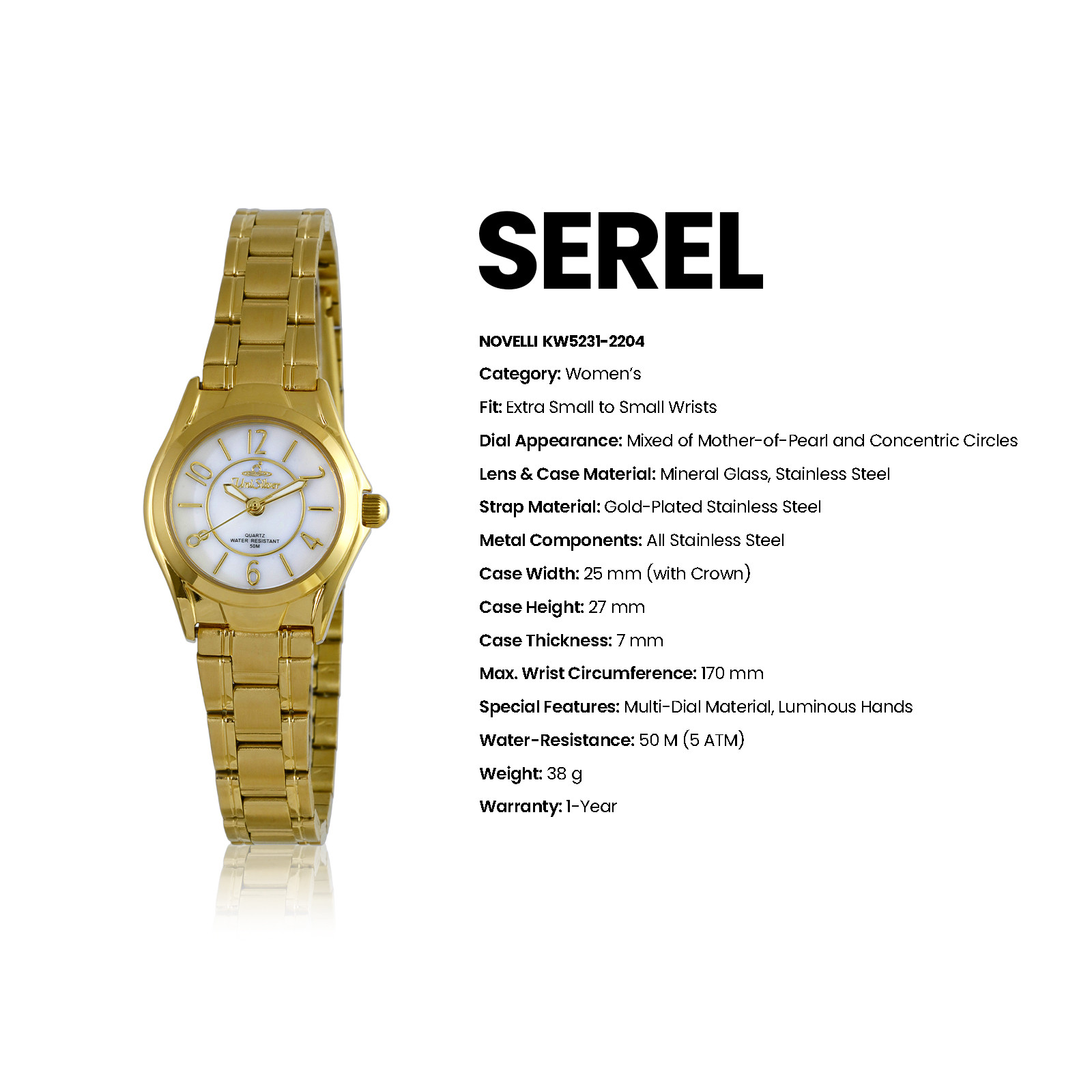 With its luminous hands, mother-of-pearl dial and refined detailing, Novelli brings quiet sophistication to every moment. Powered by reliable Japan movement and crafted in stainless steel with 50M water resistance, it’s designed to shine effortlessly from day to night.