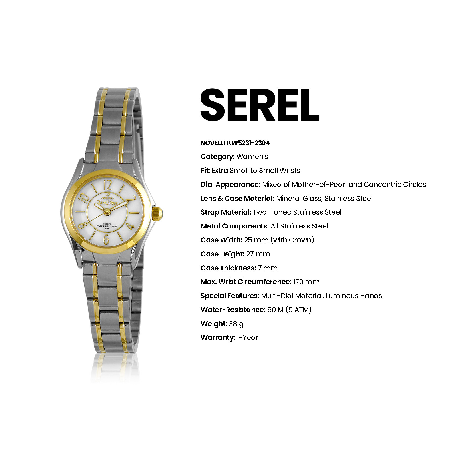 With its luminous hands, mother-of-pearl dial and refined detailing, Novelli brings quiet sophistication to every moment. Powered by reliable Japan movement and crafted in stainless steel with 50M water resistance, it’s designed to shine effortlessly from day to night.