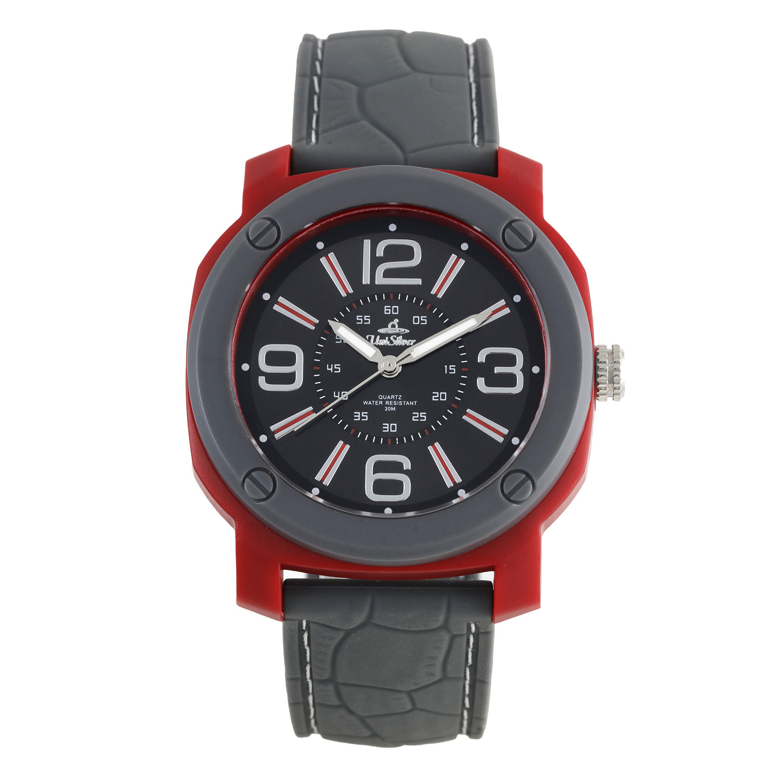 Be on the wild side of style with this ruggedly handsome timepiece. It has a detailed dial inside a uniquely shaped case, and a stitched leather-like rubber strap. Match it with your casual outfits for a top notch get up. Get the Wild Ryder only from UniSilver TIME!